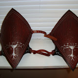 Leather hand-tooled bracers. Front piece snaps on at two points at the wrist to maintain range of motion. Leather lacing is attached by hand-stitched fabric.